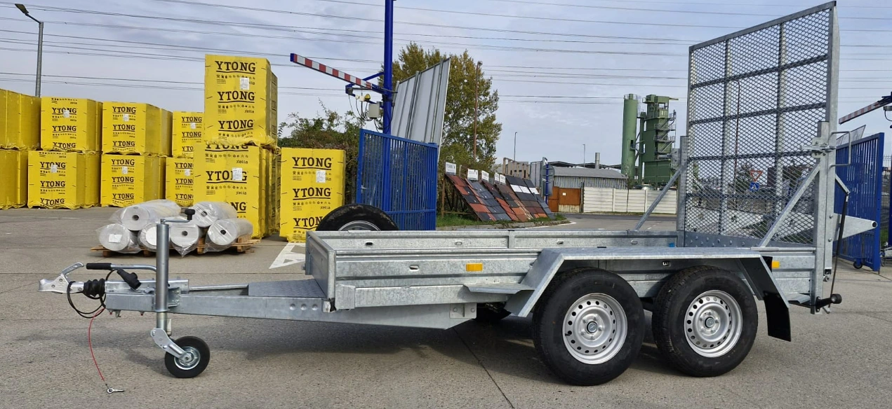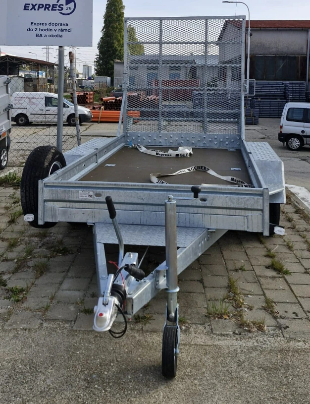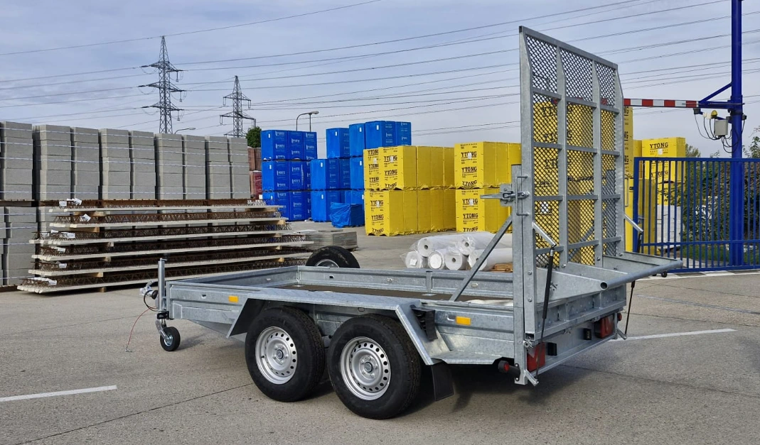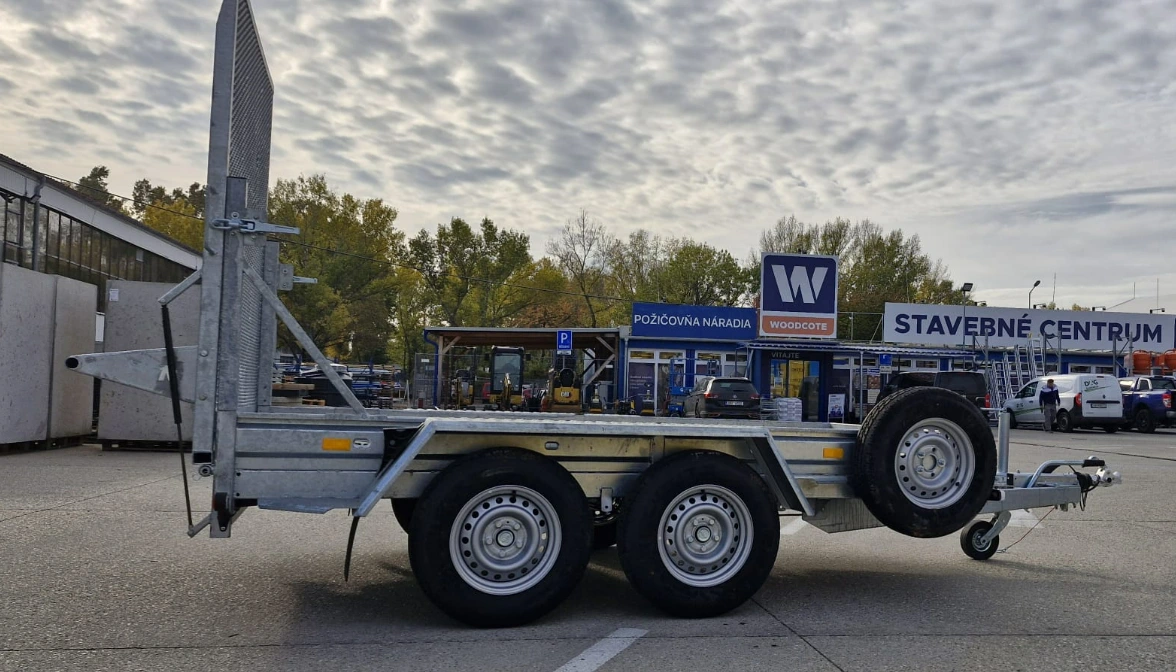Prívesný vozík na prepravu stavebných strojov, s nájazdovou rampou a s kolesami uloženými vedľa ložnej plochy.